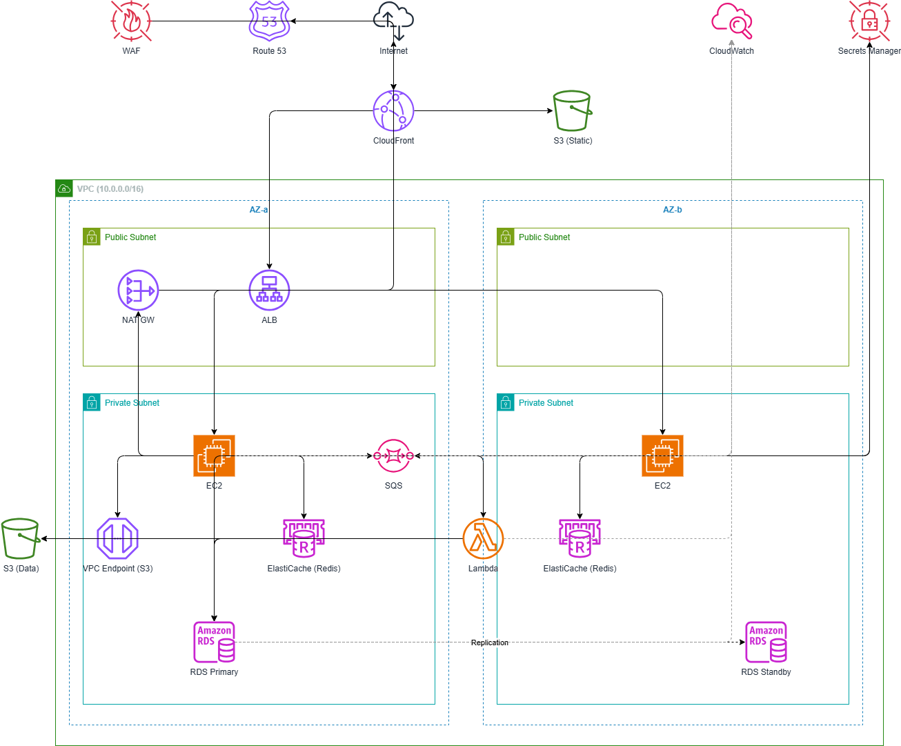 - 監視系の破線が実線と視覚的に区別されている: CloudWatchへの接続は破線+グレーで描画されており、メインのデータフローとの区別がつく