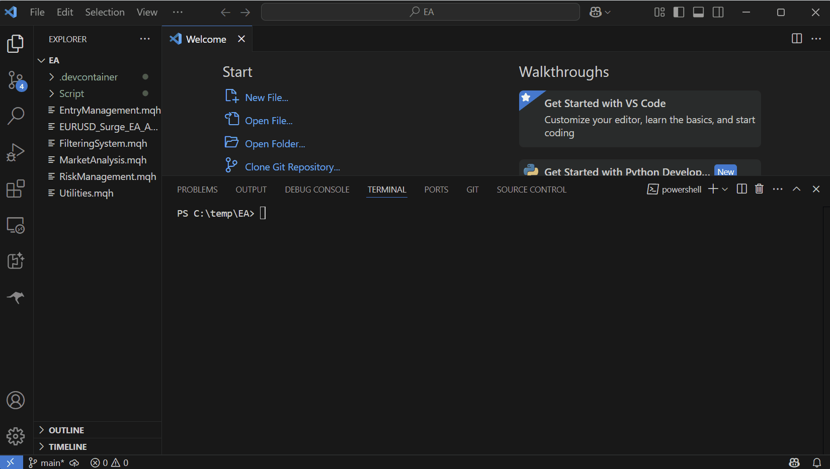 ここからはVS Codeを起動して、PowerShellのTerminalでコマンドを実行していきます。