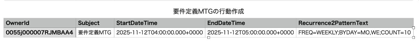 | 繰り返しパターン(Recurrence2PatternText) | 繰り返す行動のパターンを指定 | 詳細は前述の「RRULE形式とは」に記載 |