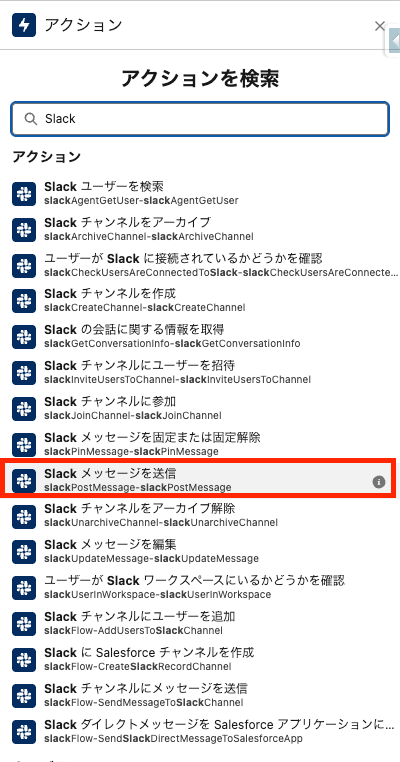 ②Slackでワークフロー作成時「Salesforceフローを実行する」を選択し①で作成したフローを選択