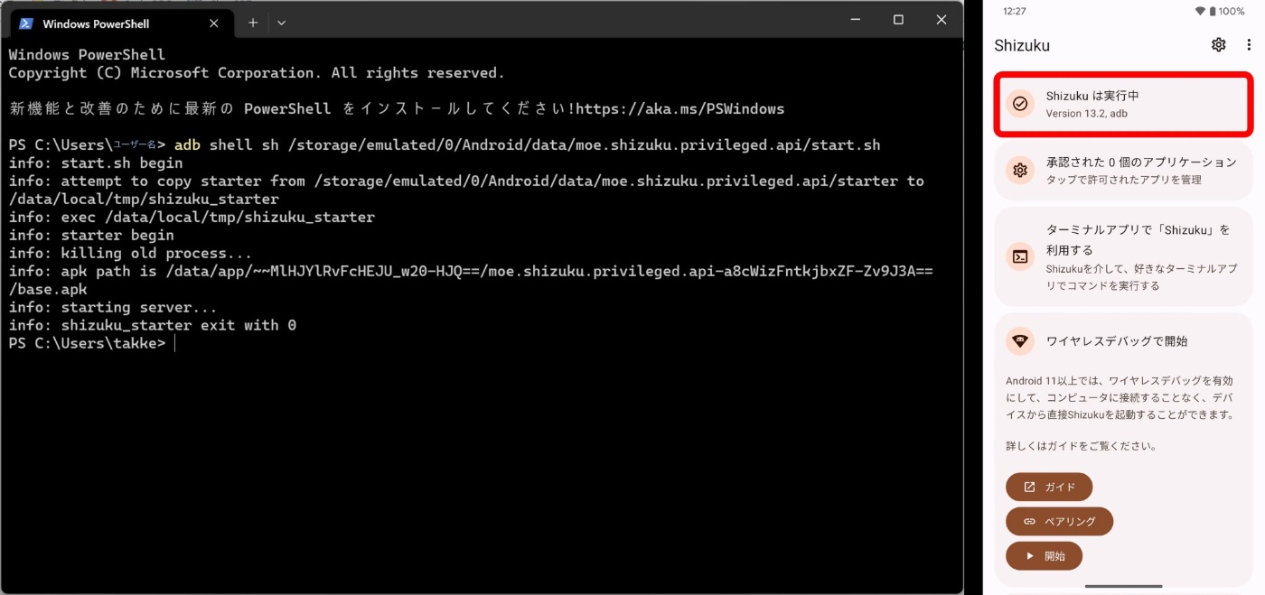 Shizukuアプリで確認したコマンドをPowerShellへ記入してください。下のように実行中という表示が出れば成功です!