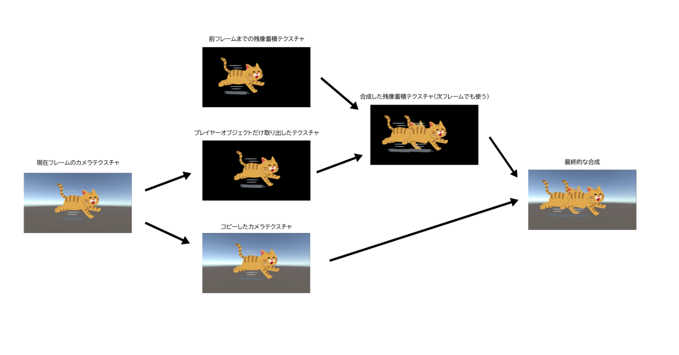 この段階でプレイヤーオブジェクトの残像が蓄積されたテクスチャが得られます。