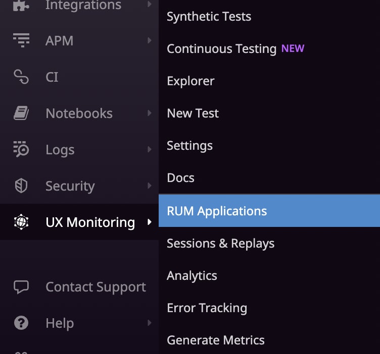 画面: Datadog の左側のタブより UX Monitoring > RUM Applications > 右上の New Application を押下する
