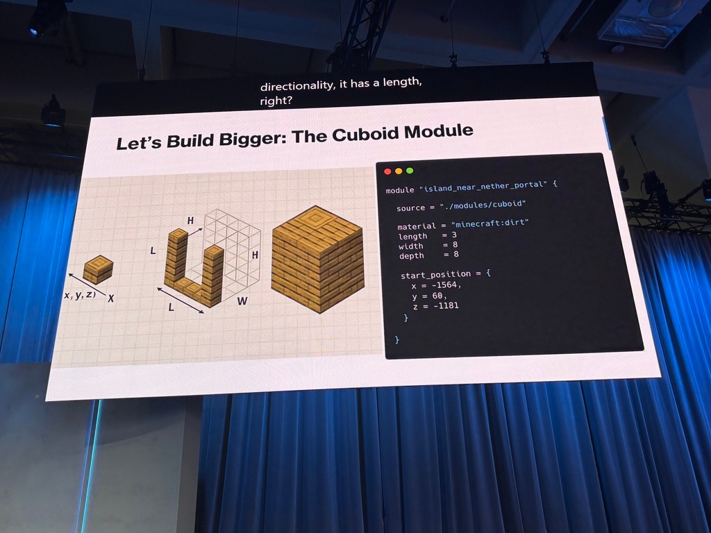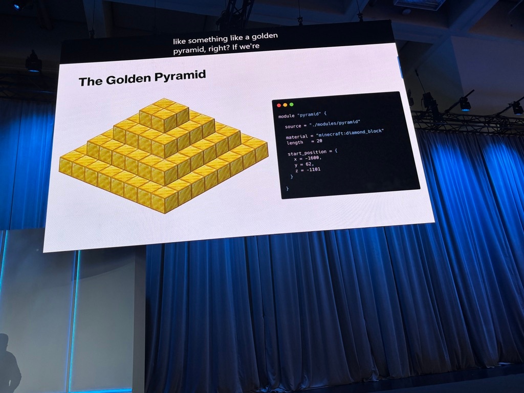 Minecraft用のterraform providerがあり、それを使ってセッション内で短時間で大量の羊を産んだり(そして○したり)、ピラミッドを一瞬で作り(そして壊す!)する実演があり改めてIaCのパワーを感じさせられました。