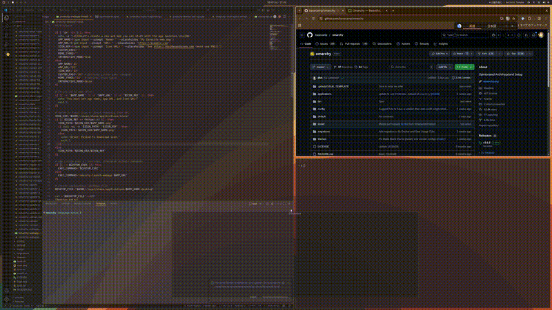 つまり Omarchy では「後付けでタイルっぽくする」のではなく、OSとウィンドウマネージャが同じレイヤーで動いているがゆえの快適さが得られるわけです。
