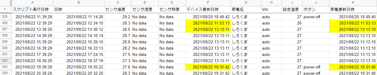 B~F列がDevices(今回の場合は、Nature Remo mini2)のデータであり、G~K列はAppliances(今回の場合はエアコン)のデータです。