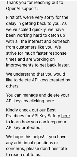 また、仮説として「Organizationから該当社員を外せば解決するはず」とは思っていたものの、それで対応不十分な場合、すなわちAPIキーがそのまま使い回せてしまう場合が怖いなと考え、OpenAIのオフィシャルな見解の収集を始めました。