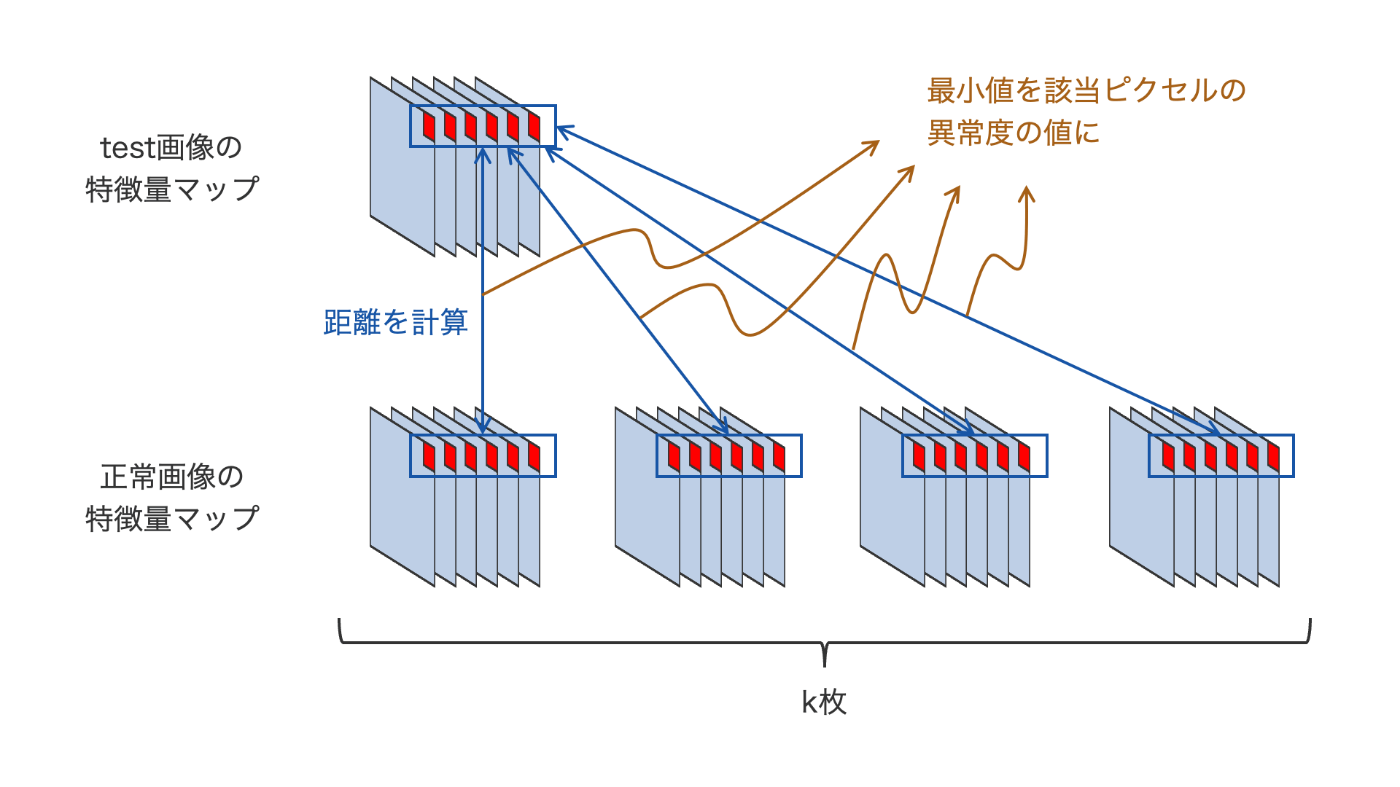 - ピクセル単位の異常度: test画像とk枚の正常画像で対応するピクセルどうしの距離を計算し、その最小値を該当ピクセルの異常度とする
