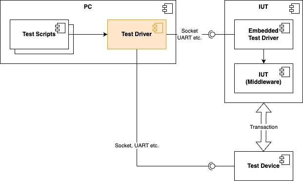 - PC で動いている Test Driver から、IUT と、IUT の通信相手となるターゲット (Test Device) にコマンドを送信し、所望の機能をトリガします