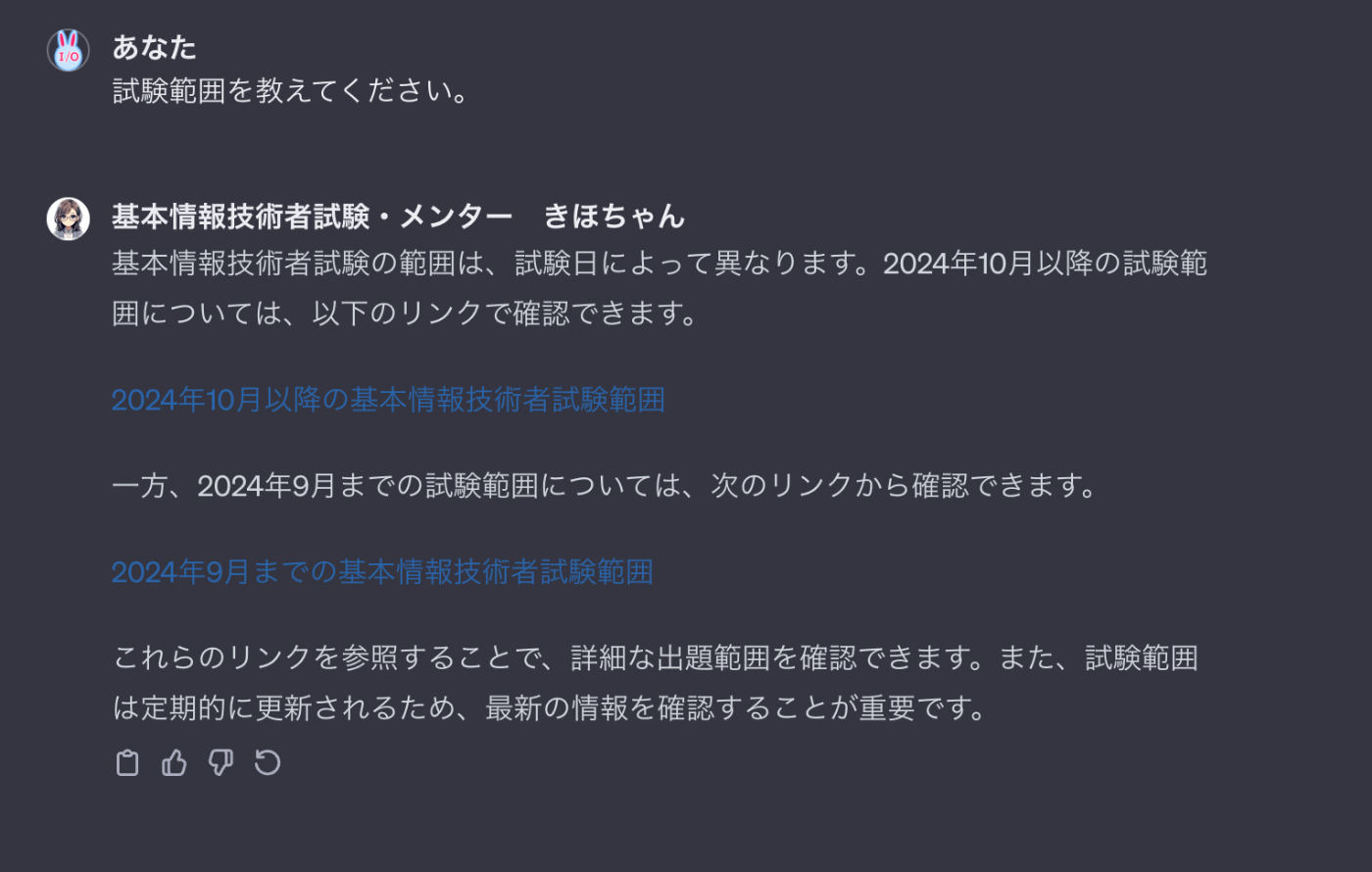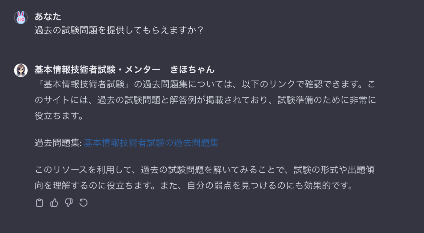例えば、今回作ったように、基本情報技術者試験に関する情報をプロンプトで読み込ませて、基本情報技術者試験のメンターとして振る舞うようなChatGPTもGPTsの1つです。