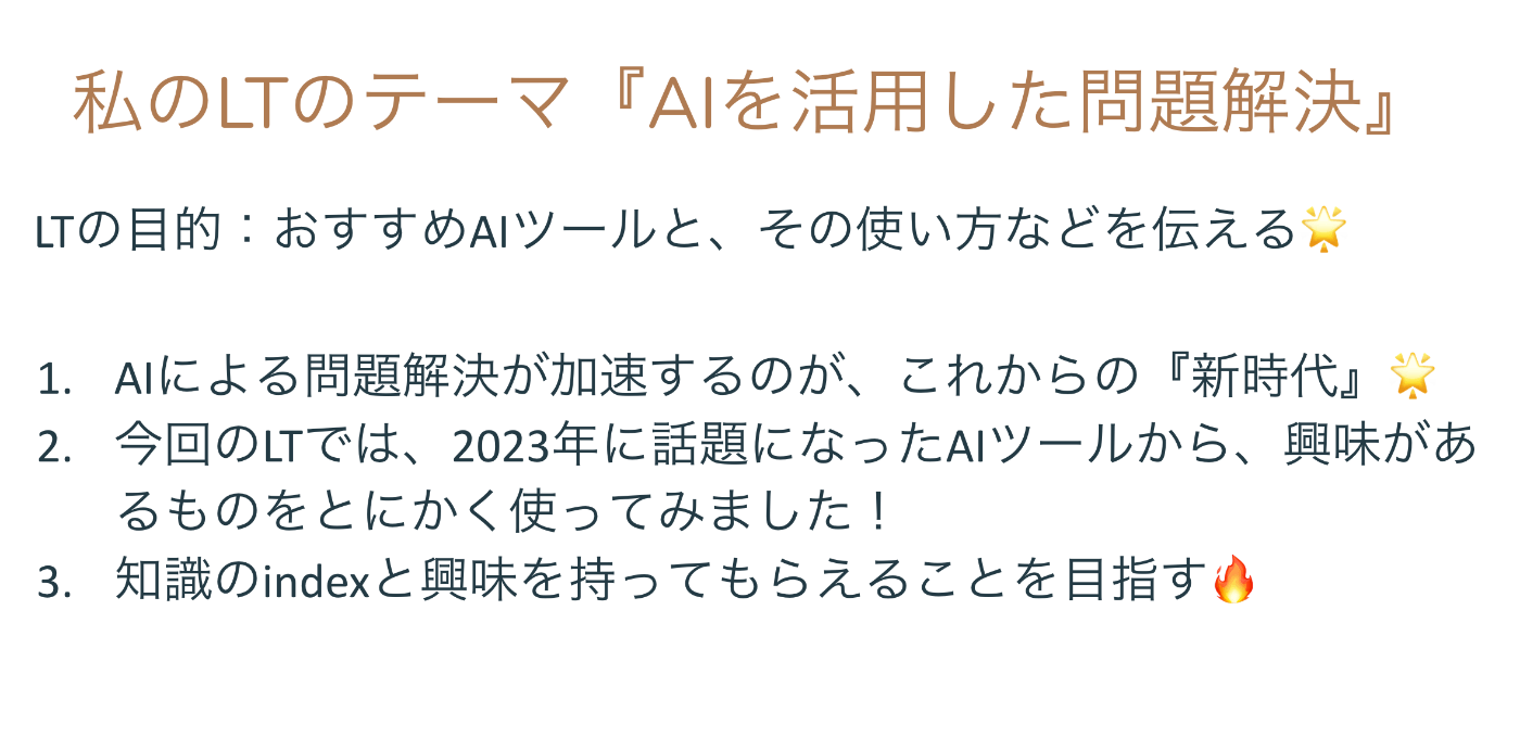LTスライドや、この記事を読んでいただいている皆さんには、AIツールの知識のindexや、興味を持ってもらえたら嬉しいです🌟