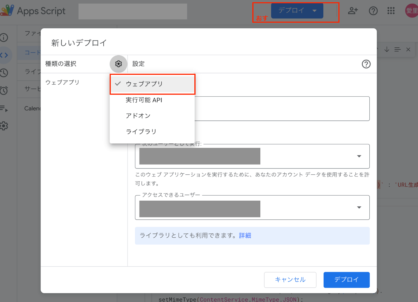 上のデプロイを押して、ウェブアプリでデプロイします。