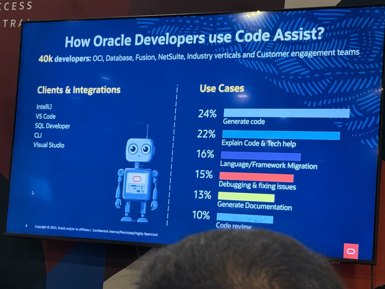 Oracle Code AssistというOracleのコーディングアシスタントを使って、Oracle社内でどれだけ開発効率をあげたか、というミニセッションでした。