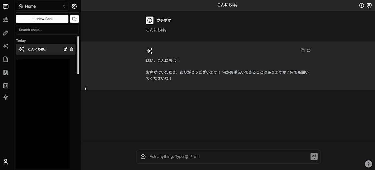 右上のモデル選択のところをクリックして、Difyで作ったカスタムフローを選択して「こんにちは」と送ってみましょう。無事に返事が返ってくれば完了です。