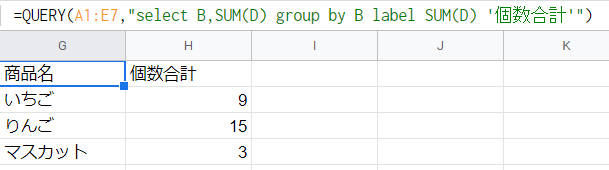 =QUERY(A1:E7,"select B,SUM(D) group by B label SUM(D) '個数合計'")
