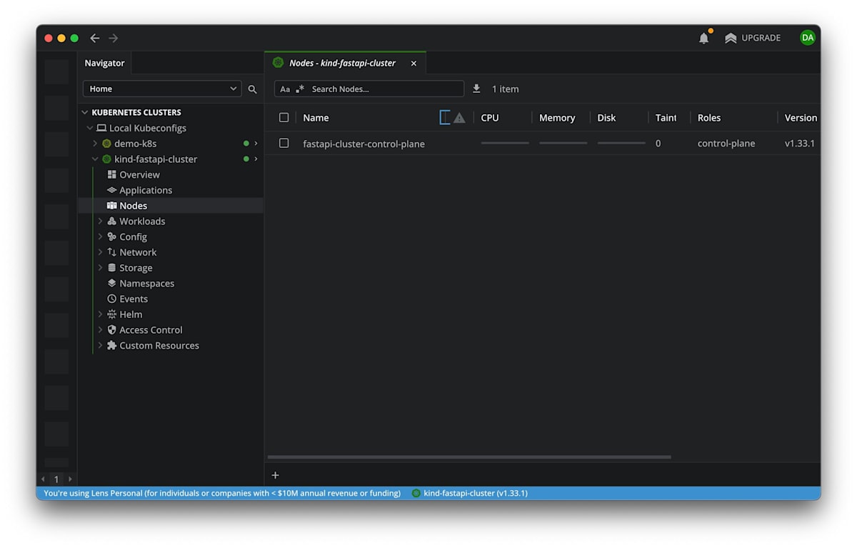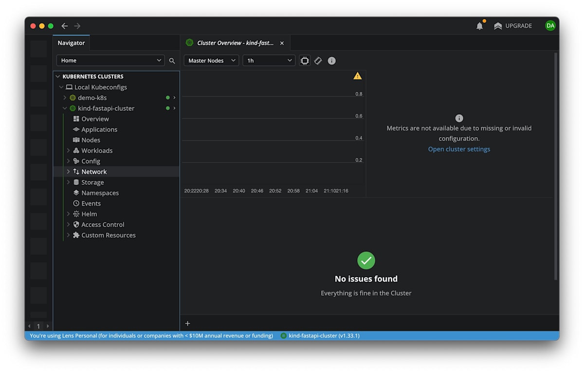 クラスタを立ち上げた段階でLensを起動すると、以下のように表示されました。