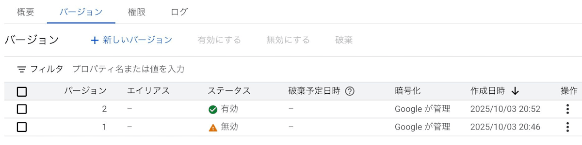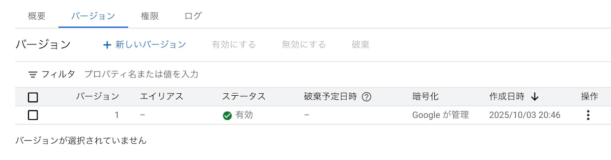 次にバージョンを確認してみましょう。現時点ではまだ一つしか登録されてないのでバージョンは1つだけ登録されていることがわかります。また、キーの値はkey-version-1
