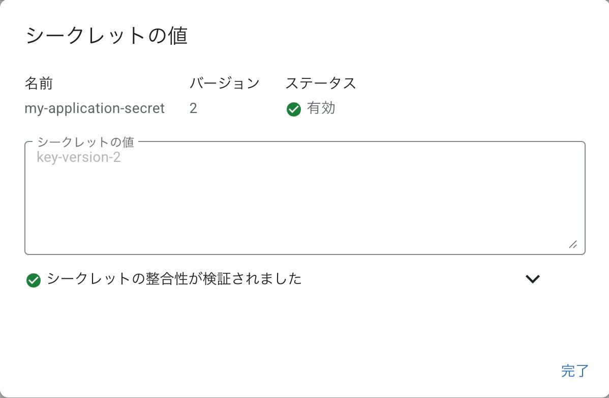 した後にバージョン情報を見るとバージョン2が作成され、その値がkey-version-2