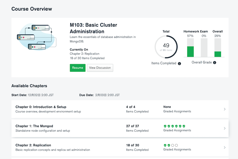 ただいまコース: M103[1]を進めています。Chapter2を1日3つぐらいずつ進めたい。