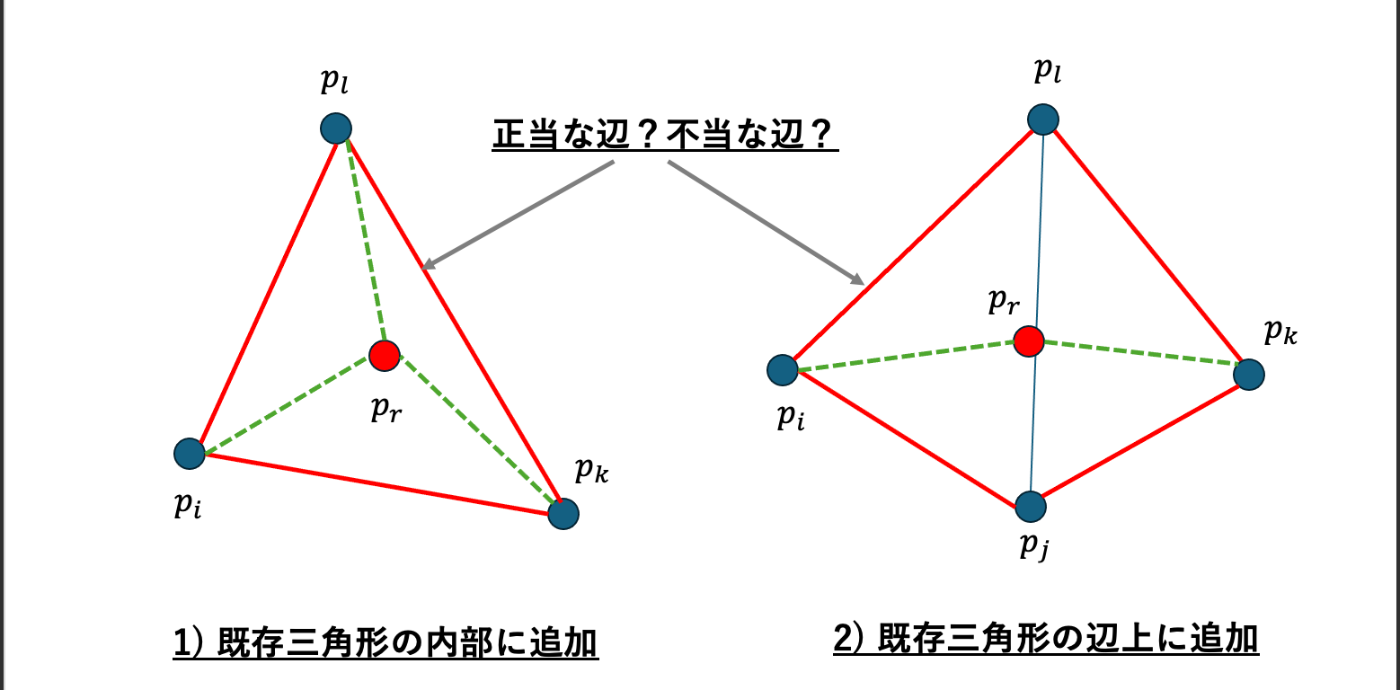 の2行目のLegalizeEdge(p_r, \bar{p_ip_j}, T) が正当性判定は, 上述した外接円判定を行う. 外接円判定についてはとても簡単な行列式があるので利用するとよいだろう.\bar{p_ip_j}