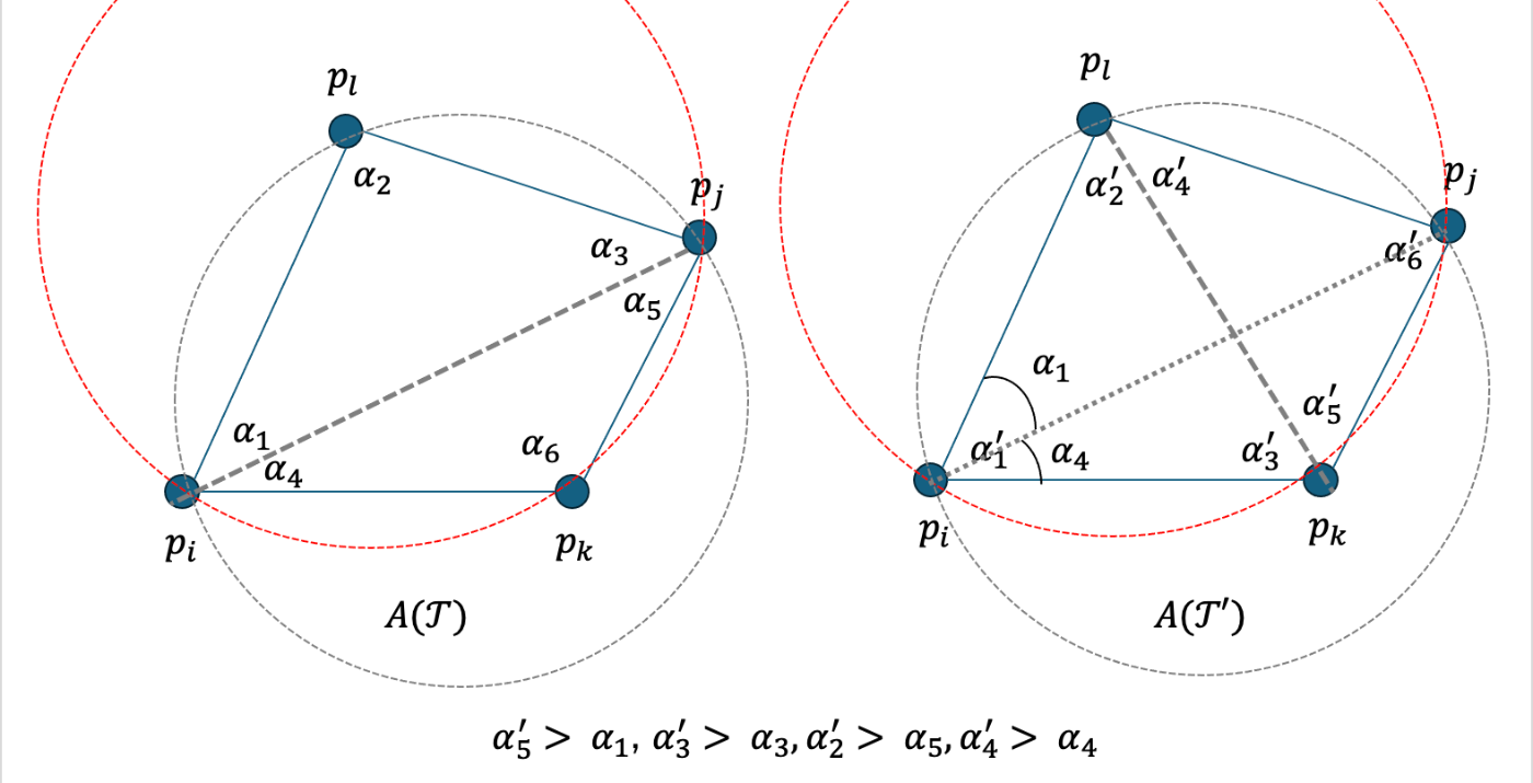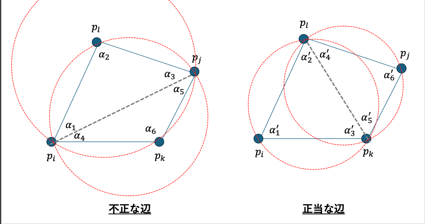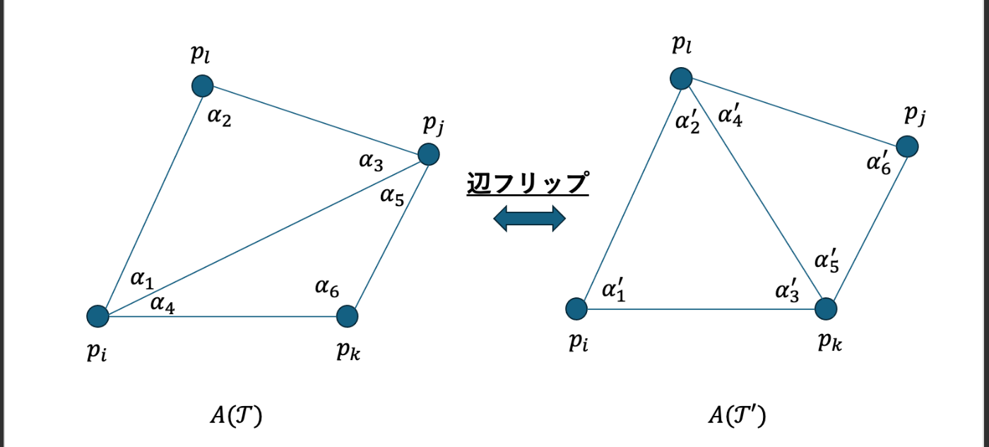 簡単な話, とりあえず何かしらの三角形分割を構成後, すべての辺に対し,正当か不当な辺であるかを判定し, 辺フリップを繰り返せばよい. 結果, これ以上辺フリップの余地がなくなればそのとき, 角度最適な三角形分割