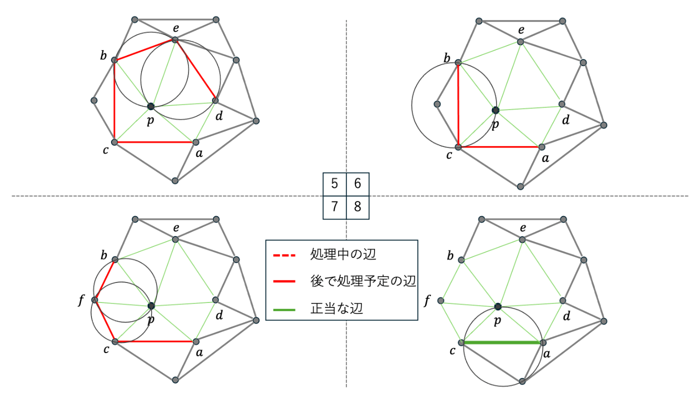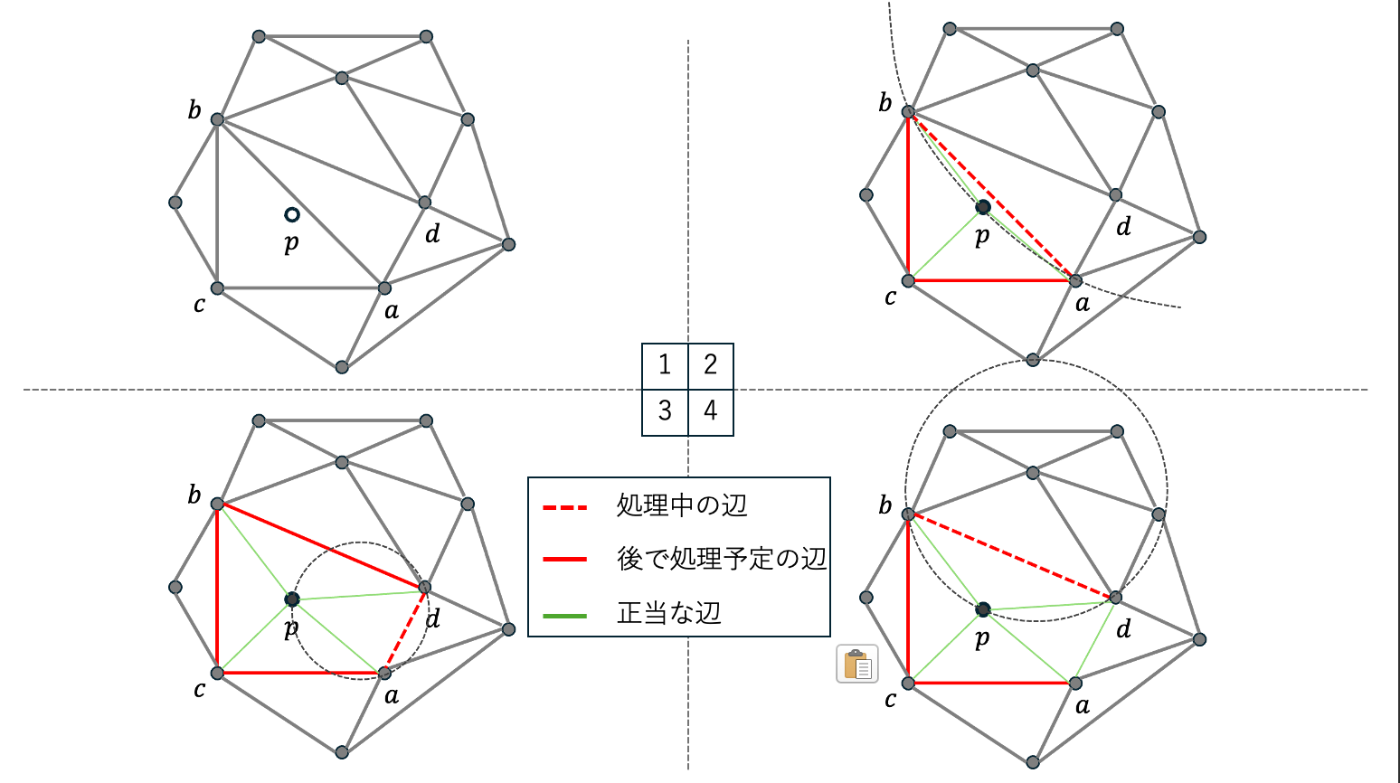 例えば先ほどの例だと, 少なくとも追加した点を内包する三角形および四角形の外周辺は不当なものである可能性がある. そのため, 外周円判定を行い, 必要に応じて辺フリップを行う必要がある.