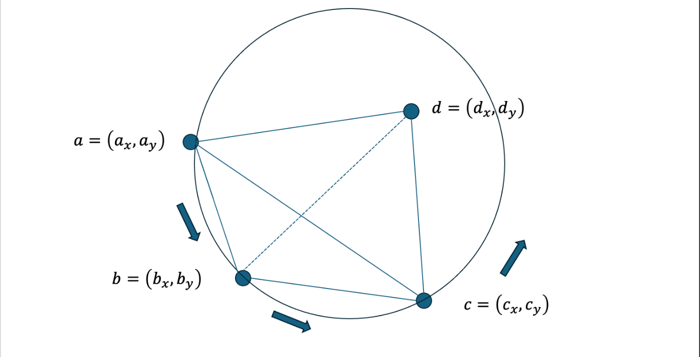 - 1のとき, この外接円に3点以外の点が含まれている場合, その三角形には不当な辺を含んでいると判定する.