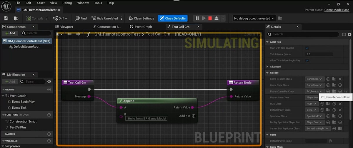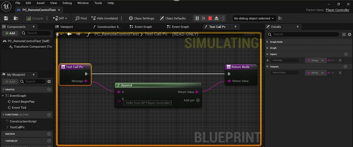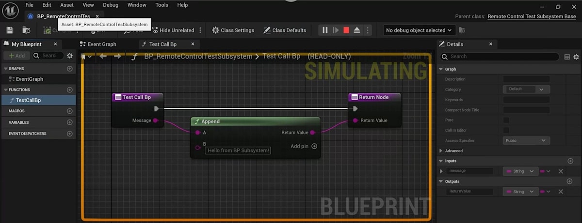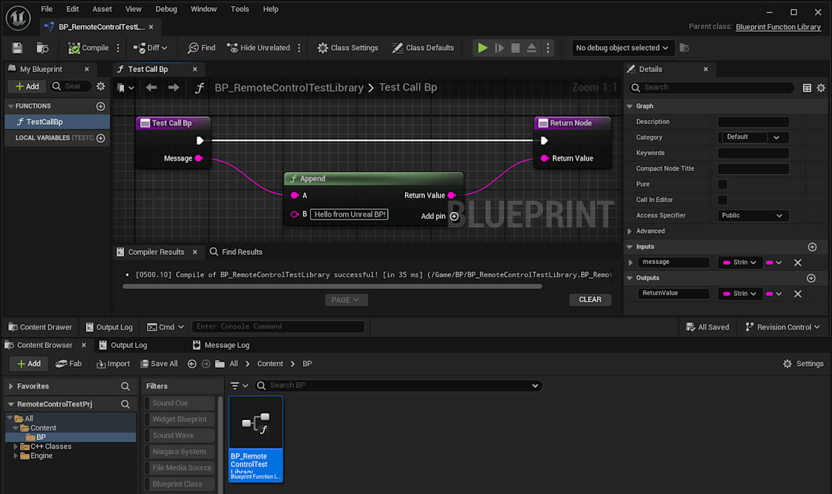 同じことをBPでもやればいいじゃんということで、「BP_RemoteControlTestLibrary」というBPクラスを追加し、関数を実装します。