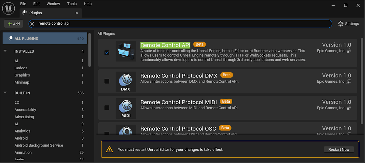 使い始める準備としては、[Edit (編集)] > [Plugins (プラグイン)] から [Remote Control API] を有効化してエディタを再起動するだけです。