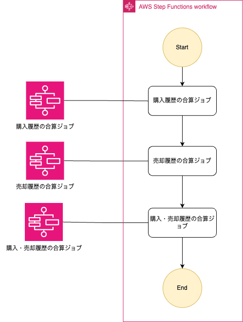 ジョブ連携の流れとしては、EventBridge Scheduler で 0 時に購入履歴の合算ジョブを行うワークフローを起動し、ジョブ終了後ワークフロー内から AWS Step Functions の Start Execution タスクを使用して売却履歴の合算ジョブを起動、その後同じ様にジョブ終了後ワークフロー内から AWS Step Functions の Start Execution タスクを使用して売却履歴の合算ジョブを起動という流れになります。