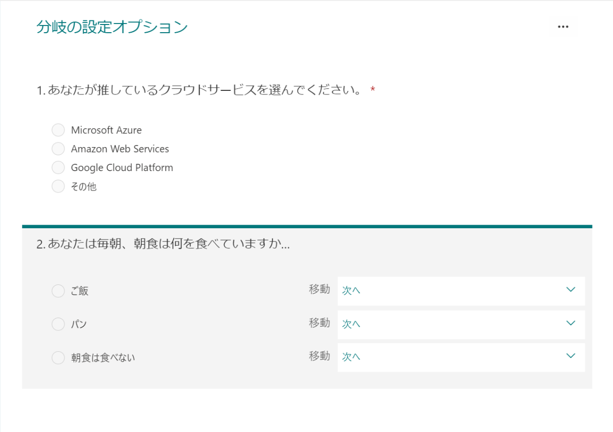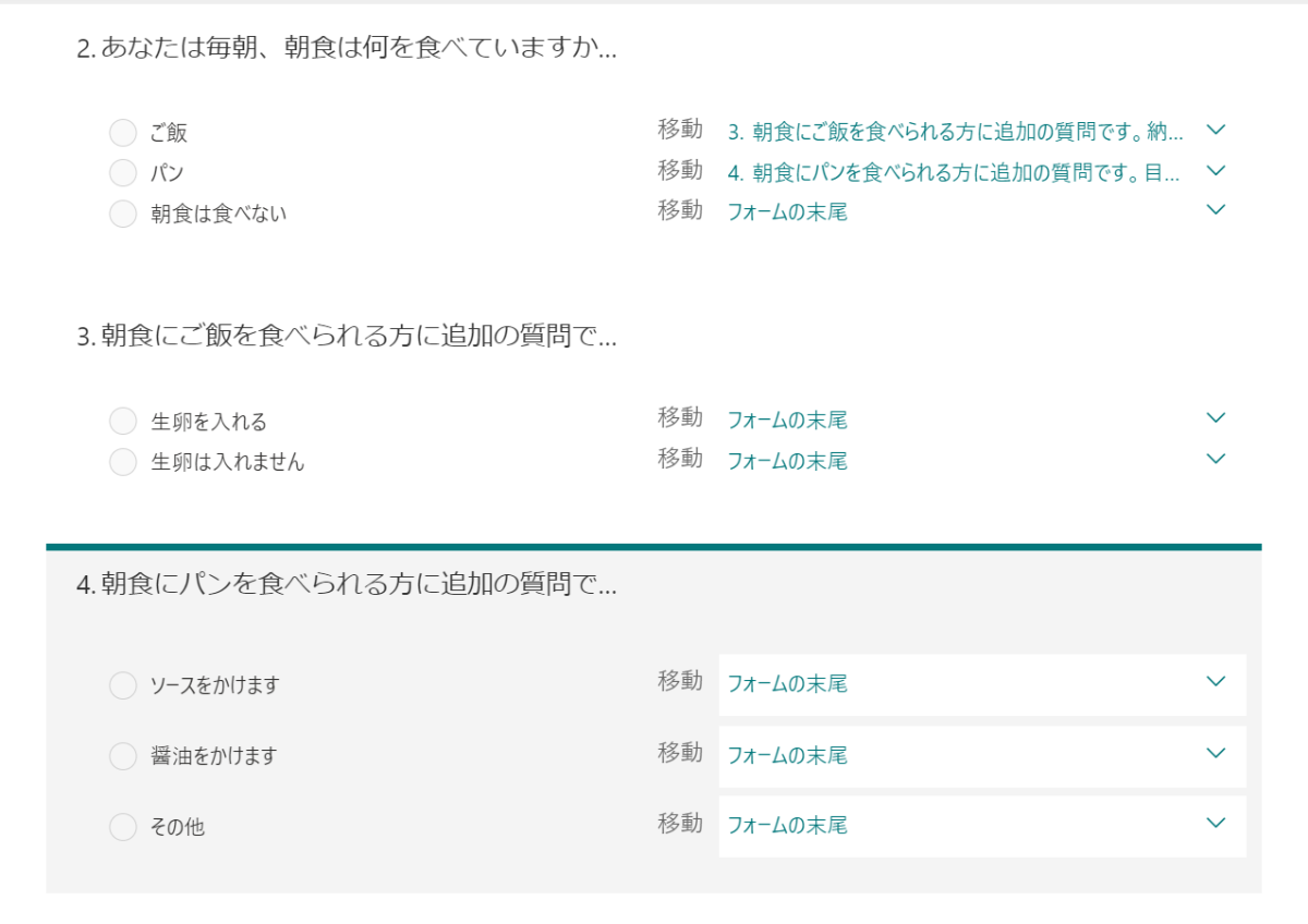 第2問で、ご飯を選んだ方には続けて第3問へ分岐していただく。パンを選んだ方には、第4問へ分岐していただく設定が画像のような状態です。