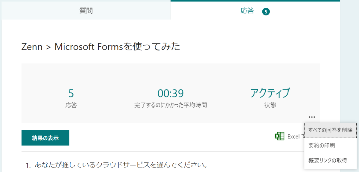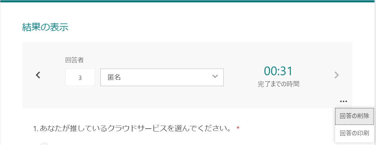 なお、動作確認した後に、アンケート結果のリセットというか削除は下記の画面で「・・・」をクリックすると個別に「回答の削除」が選択できます。