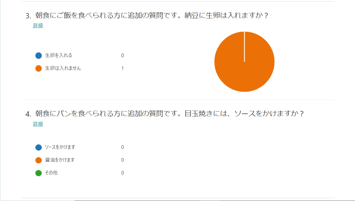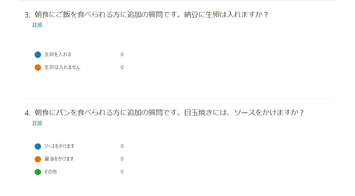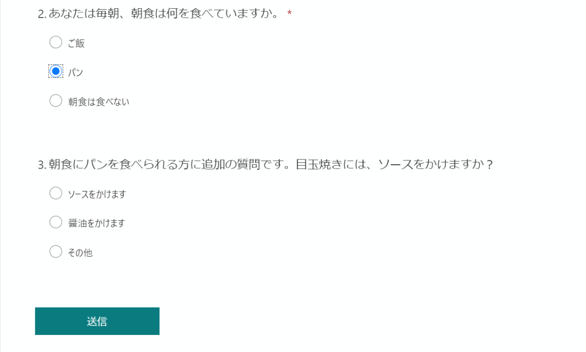 第2問で「パン」と回答すると、条件分岐が働いて、後続の第3問が表示されました。