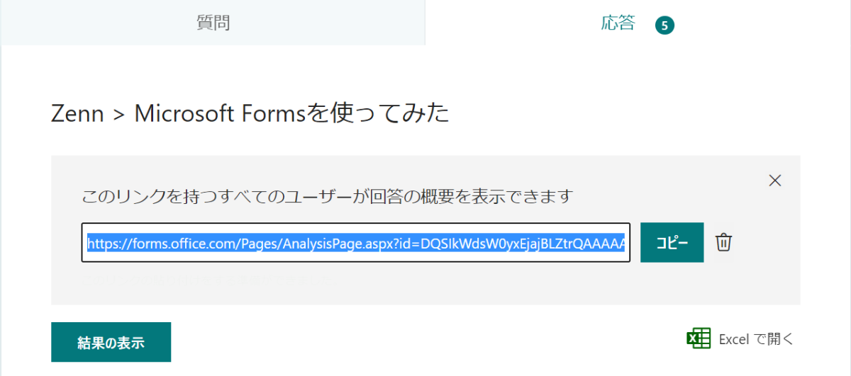 なお、先ほどの画面で表示されていた「概要リンクの取得」をクリックすると、アンケート結果の集計画面を共有できるURLがコピー出来ます。