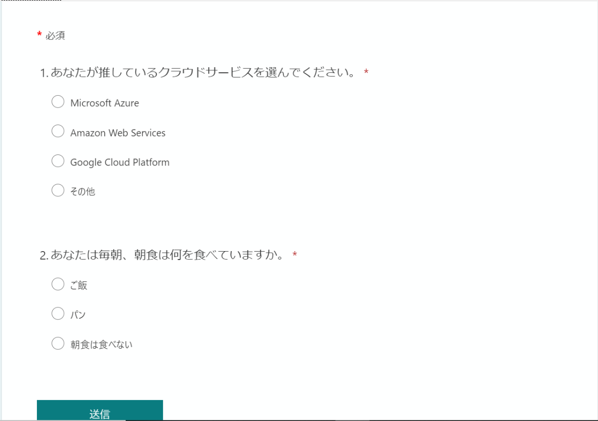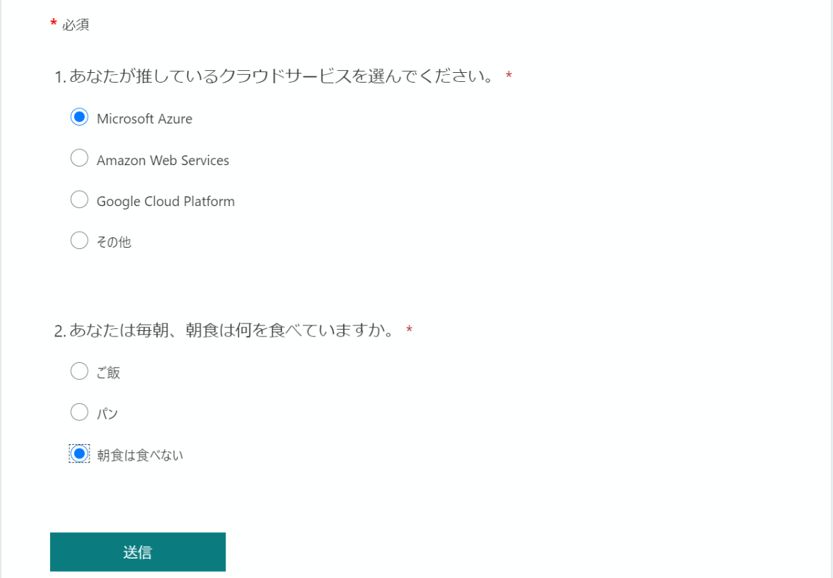 第1問と第2問は選択必須の設定にしたので、無選択で「送信」ボタンを押下すると、