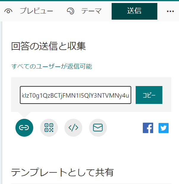 「回答の送信と収集」と表示されるので、「コピー」を押下するとURLリンクがコピー出来ます。