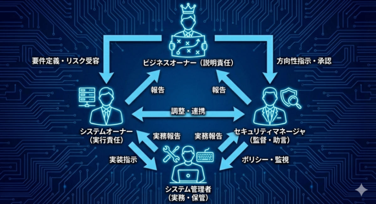 - ビジネスオーナーは企業の最高責任者、システムオーナーは現場の最高責任者、システム管理者は現場の作業者である