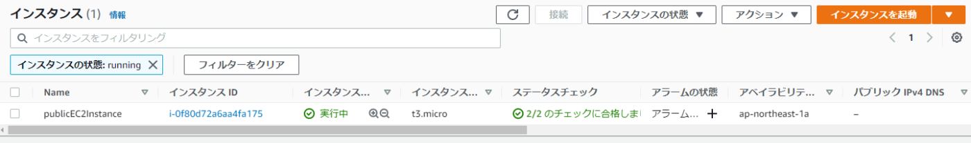 - AWSマネジメントコンソールでEC2の画面に移動して、EC2インスタンスが作成されていることを確認する。