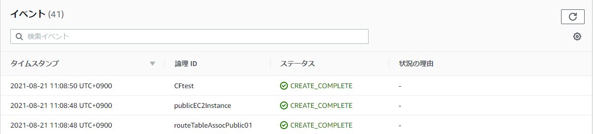 スタックの作成をクリック - イベントタブで、作成したスタックのステータスが