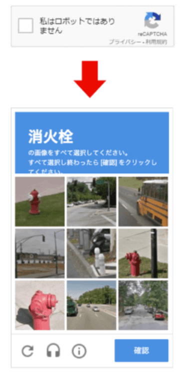 現在 reCAPTCHA には v2 と v3 の2つのバージョンが提供されており、v2 は以下の画像のようにユーザーにパズルを解かせて bot でないか判断する仕組みになっています。パズルを解いた事がある方も多いと思います。