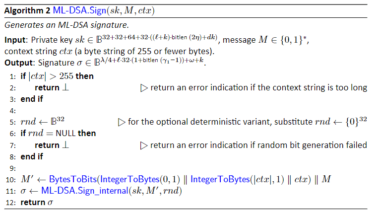 ctxは通常empty-stringだが、アプリケーションによっては使う。署名生成はheadged (randomized) veriantとdeterministic variantが存在し、deterministicの場合は5行目の乱数生成が32バイトの0で固定される。hedged variantはサイドチャネル攻撃を緩和するため、SCAを考慮する環境ではdeterministic variantは使うべきではないとしている。