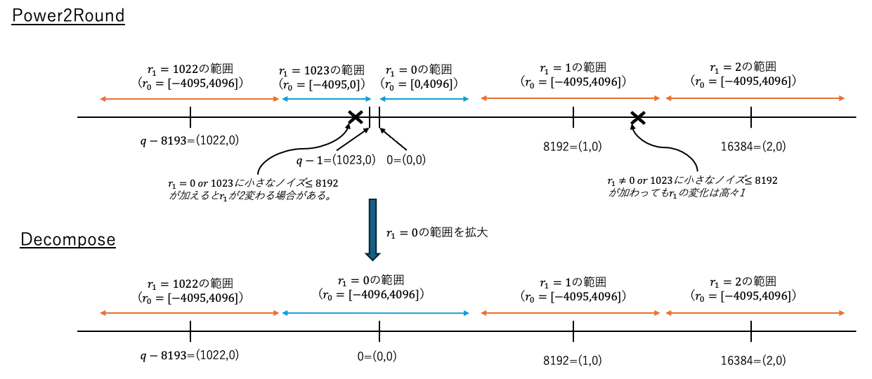 これを避けるためにやや力技であるが、Decomposeではr_1=1023のケースを排除し、r_1=0のケースを拡大することで小さなノイズ\le 8192の補正を1ビットでやってのけるのである。