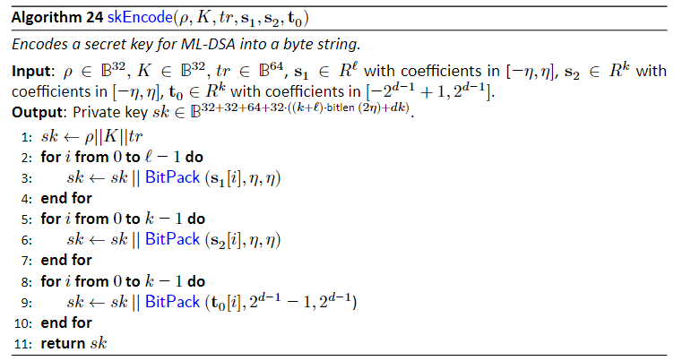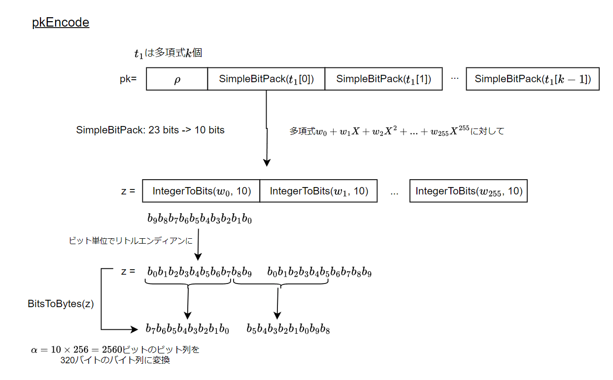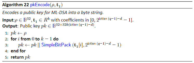 バイト列\rhoと、多項式列t_1をバイト列pkにエンコードする。t_1をバイト列に直すためにSimpleBitPack関数を使う。単に係数を詰められるだけバイト列に詰め込んだだけである。