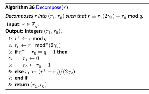 DecomposeはPower2Roundのように値を二つに分割する関数であり、HighBits/LowBitsはその上位/下位桁のみを出力するものである。処理的にはPower2Roundとほとんど同じであるが、r^+-r_0=q-1のケースで特殊な分岐を入れているのが大きな違いである。