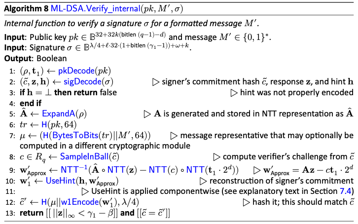 このようなSimplified ML-DSAは厳密にはcorrectnessを示せないが、Schnorr署名と対応させるとなんとなく各変数の役割がわかるだろう。実際のML-DSAはcorrectnessを満たすためもしくは署名長・鍵長を短くするために値の下位ビットを捨てる処理が入っており、かつNTT表現が仕様に入っているので複雑になる。