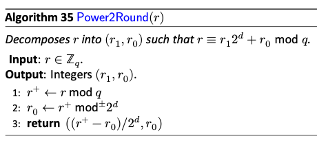 23ビットのZ_qを上位10ビットと下位23ビットに分ける関数である。下位桁の値を[-4095,4096]のレンジにするため、単純にビット分解するだけではない。