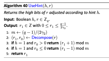 前述したようにML-DSAはDecomposeにより分解した値の上位ビットのみを使って計算を行う。当然この時下位ビットの情報がなければ正確な計算ができないわけだが、下位ビットによる影響を1ビットのヒントに押し込めることでcorrectnessを達成している。