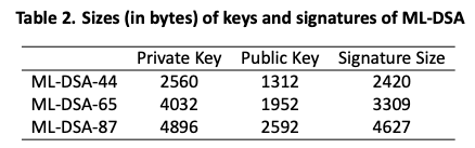 ちなみに鍵・署名サイズは以下である。PQCの中では頑張っている方だが、ECDSAが32バイト〜、RSAでさえ数百バイトであることを考えると確かにでかい。
