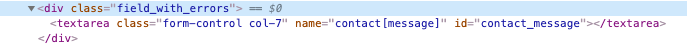 エラー発生後のhtmlを検証ツールで確認すると、inputタグ(名前入力フォーム)とtextareaタグ(メッセージ入力フォーム)を囲むように新たなdivタグが出現していることがわかりました。