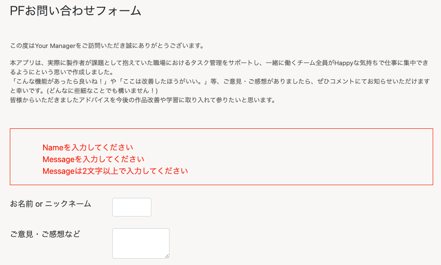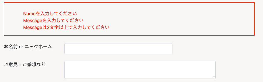 入力する名前とメッセージにはそれぞれ次のようにバリデーションを記述